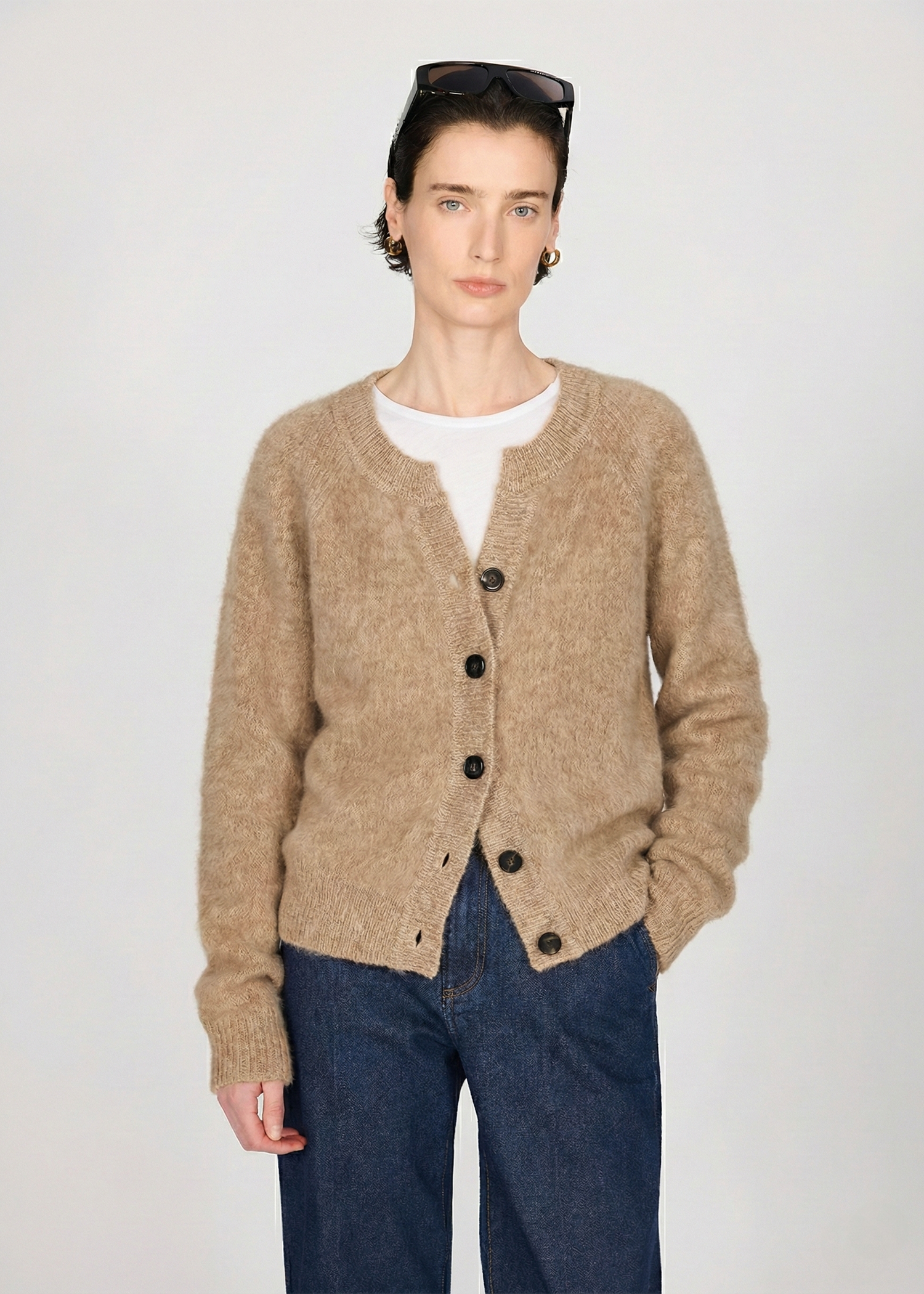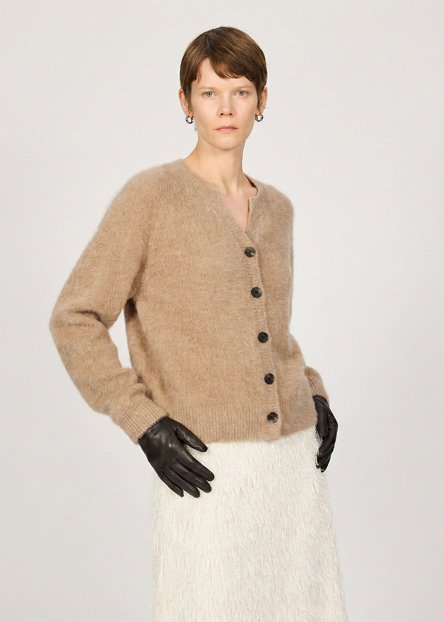 Granting pure cashmere an even softer hand feel, this cardigan is crafted from a brushed version of the yarn for a fluffier finish. The ribbed trims add structure to the relaxed shape while dark horn buttons add a subtle lustre.