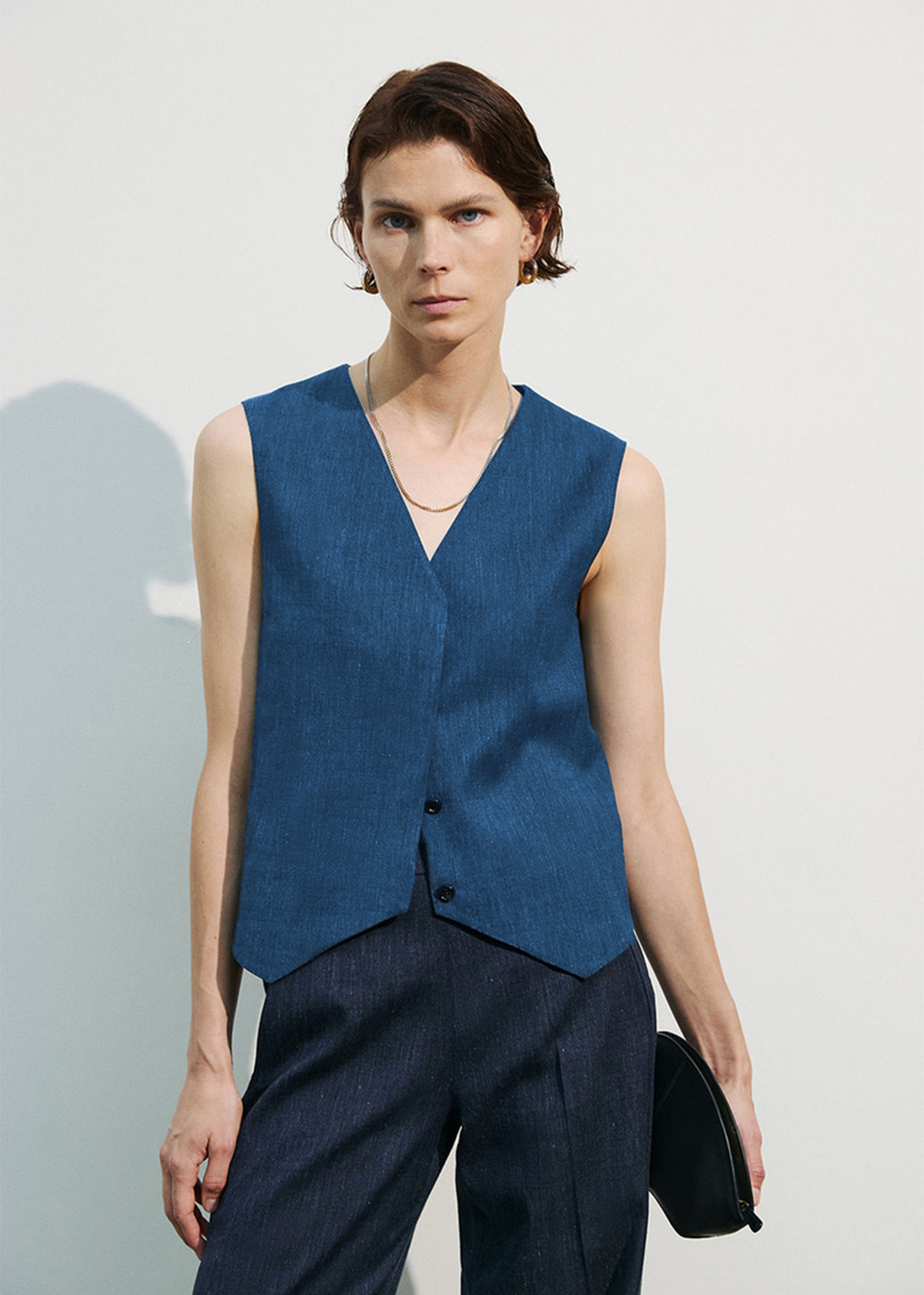 Embrace versatility with the Juniper Theory Studio handmade waistcoat. Crafted from pure French flax. The front princess seams flatter your silhouette. Whether worn on its own as a chic top or layered for added warmth and dimension, it exudes timeless sophistication. Elevate your wardrobe with this impeccable piece that pairs effortlessly with the lyocell volume skirt or tailored trousers.