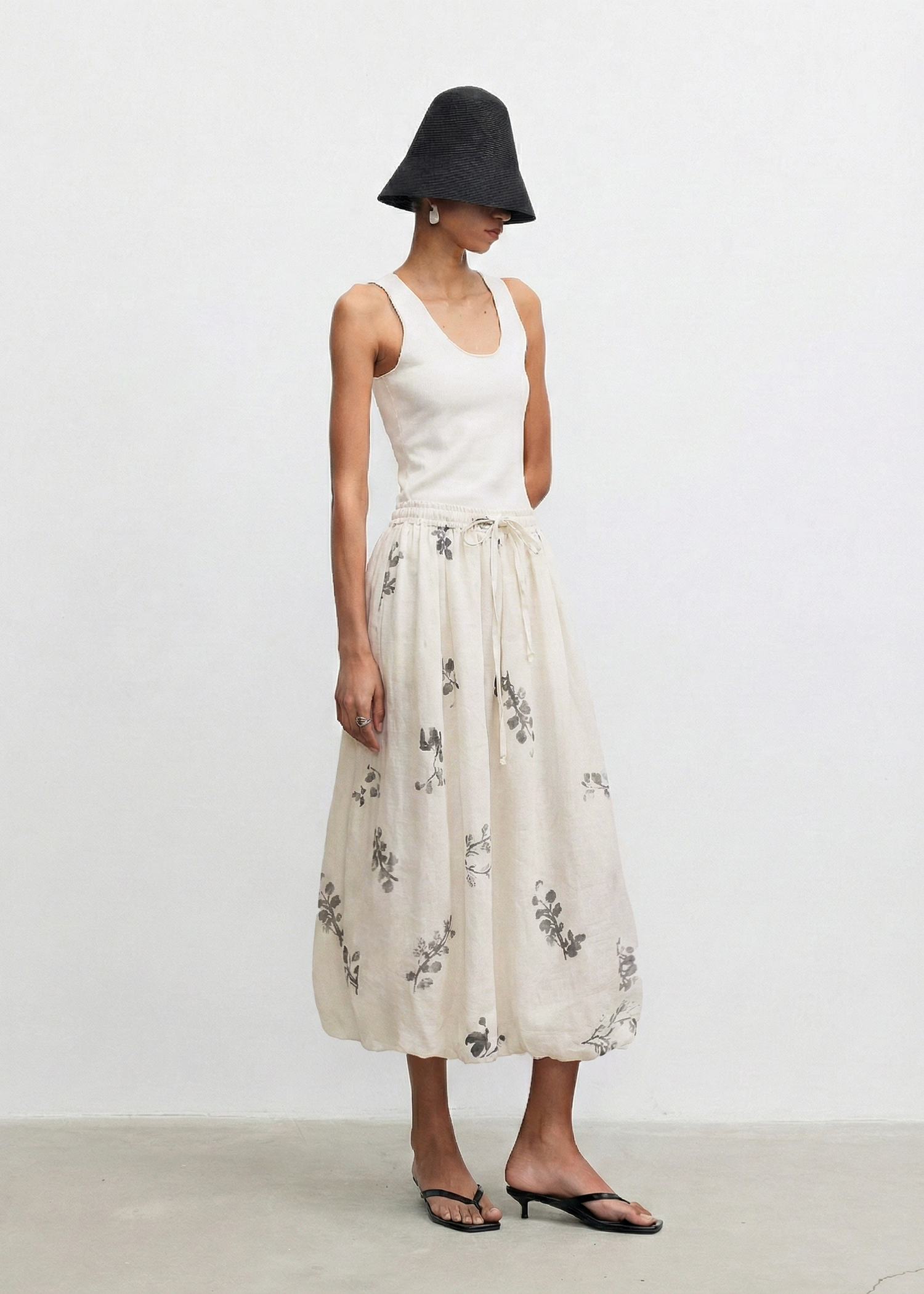 A study in lightness and quiet texture, this midi skirt is crafted from airy 100% ramie, chosen for its natural structure and breathability. The softly gathered waist creates a rounded, voluminous silhouette that moves with ease, while the subtle botanical motif adds an understated point of interest. Fully lined in 100% cotton for comfort and opacity, it’s designed to sit effortlessly from everyday wear to more considered occasions.