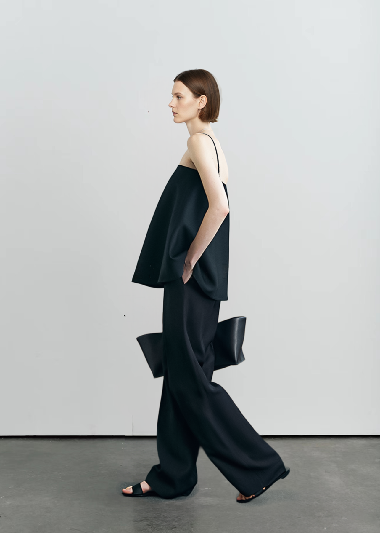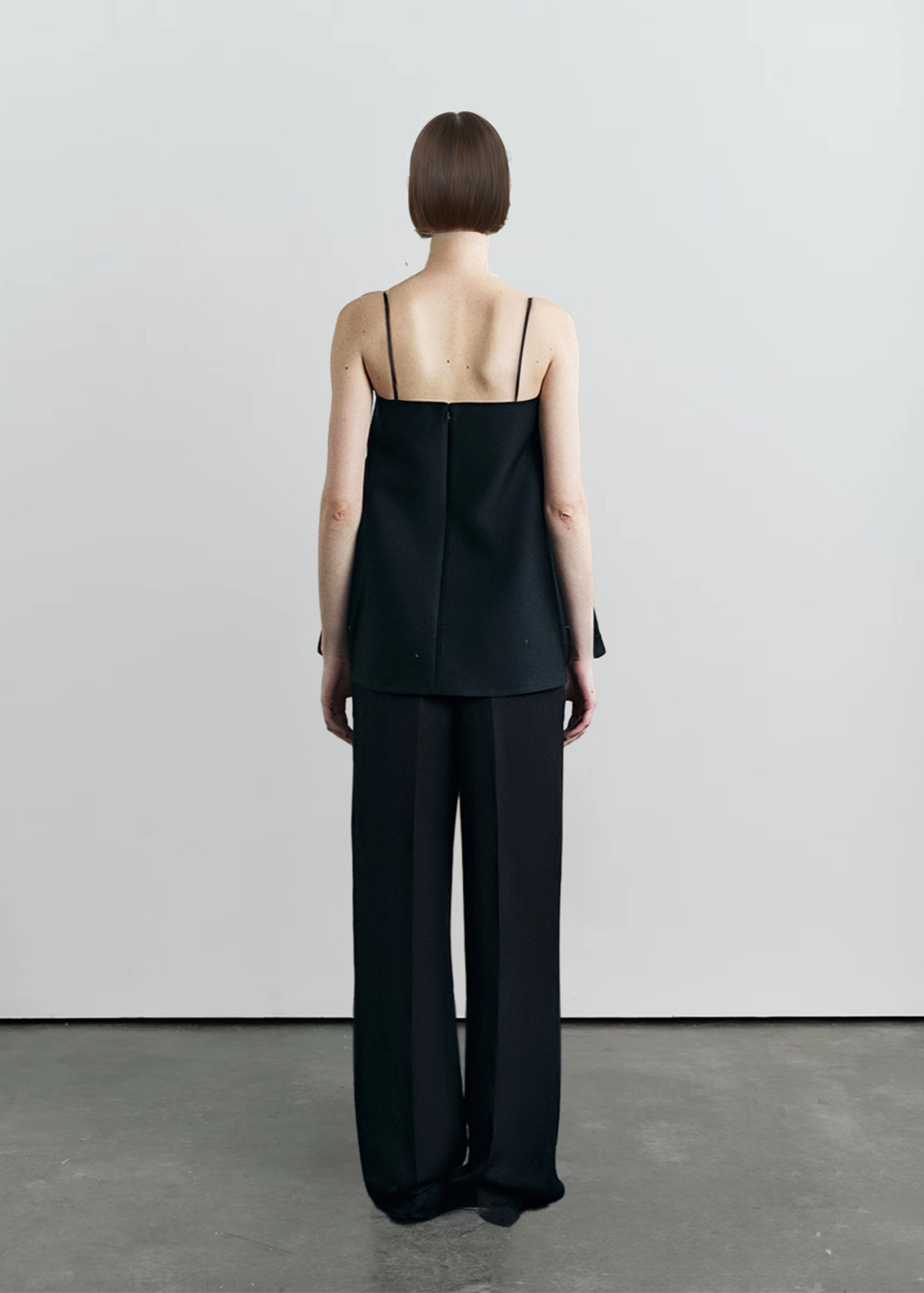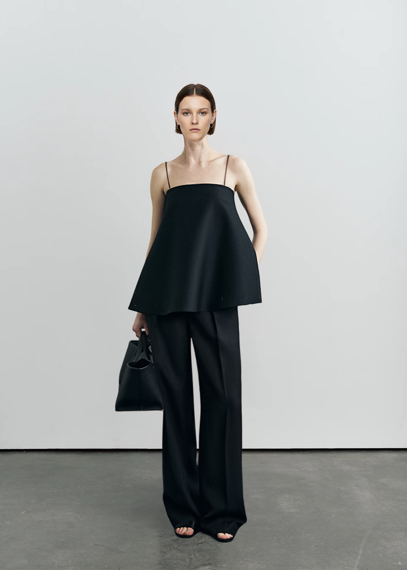 A modern reimagination of the classic camisole, this sculpted swing top is cut in a voluminous silhouette that drapes effortlessly from delicate spaghetti straps. Crafted from a premium wool-blend, it offers both structure and fluidity, making it a statement piece for elevated day-to-night dressing. Pair it with tailored trousers for a refined minimalist look or layer under a blazer for architectural edge.